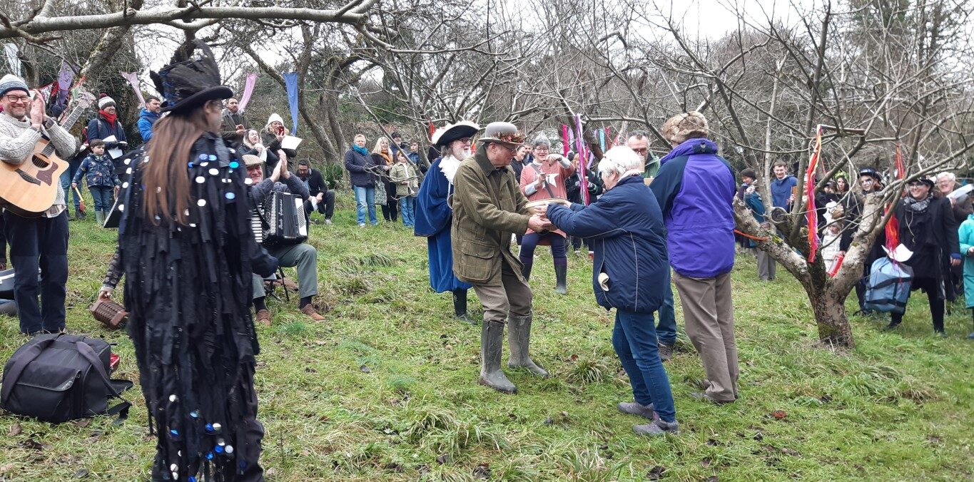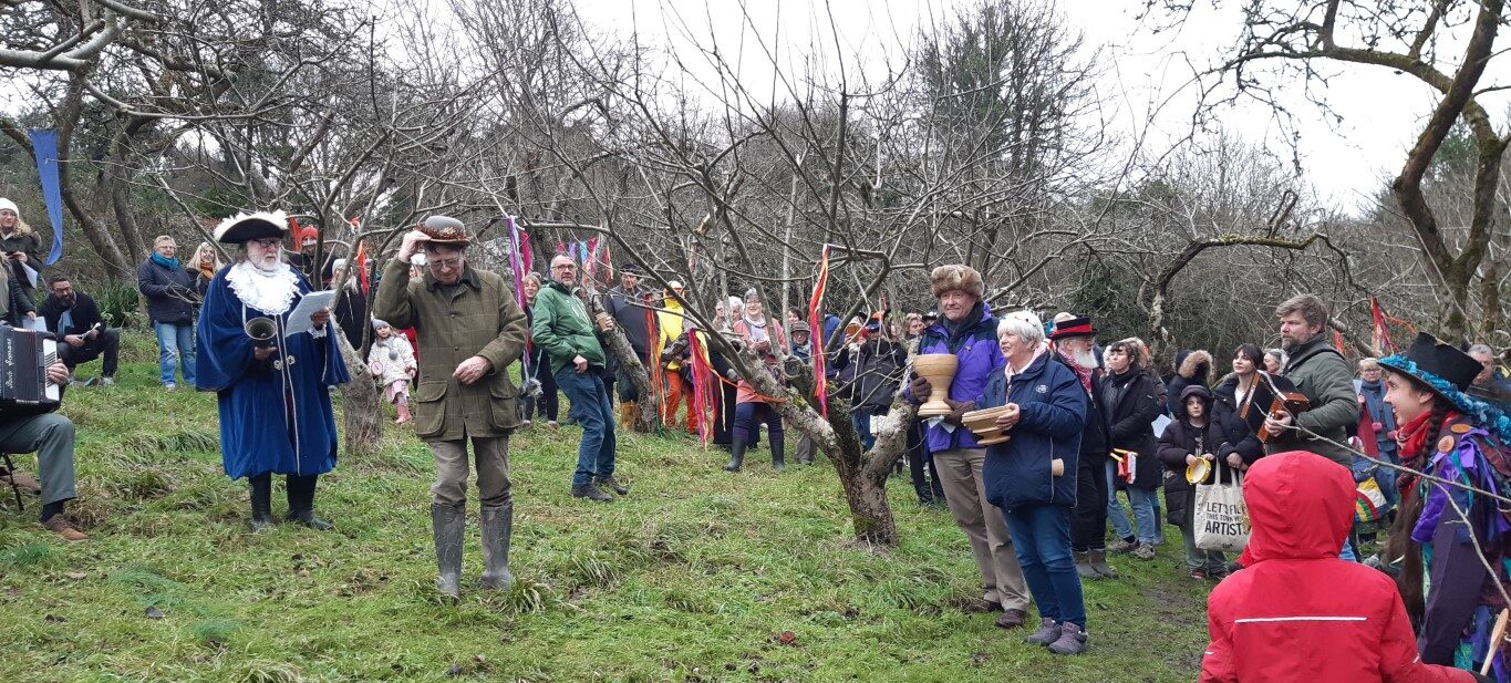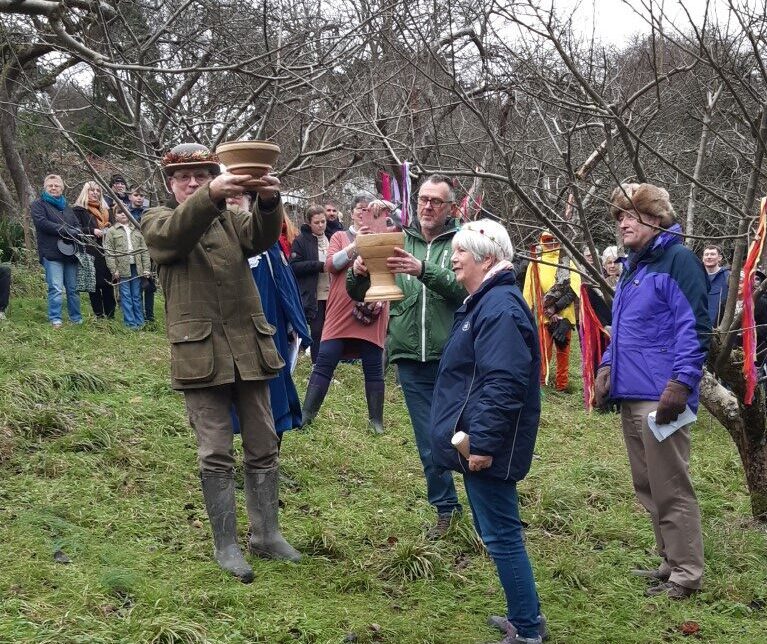 “Dan and Anya’s children were the wassail king and queen and, being only tiny, were able to sit on the orchard’s biggest and oldest tree,” said orchard volunteer Karen Lewis-Jones. “Their heads encircled by crowns of twigs and moss, while it was serenaded with songs before cider was poured around its roots.”