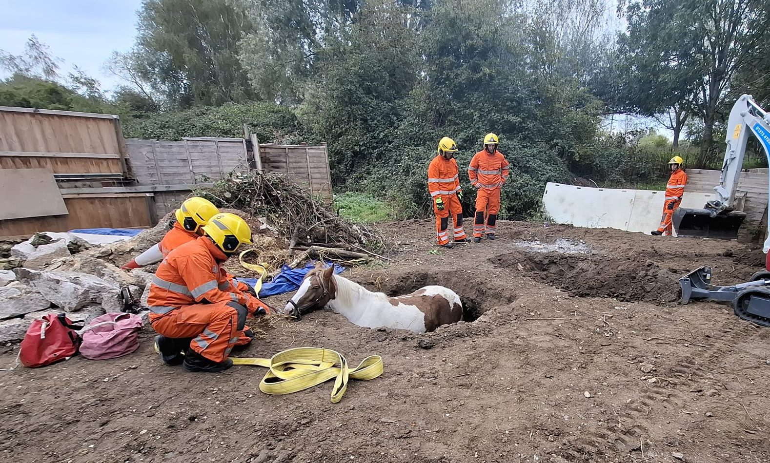 Four horses had entered the garden through a broken fence, but one pregnant horse became trapped in the deep soakaway hole. Firefighters worked carefully to free the animal, using an on-site mechanical digger to widen the area and allow the horse to be lifted to safety.