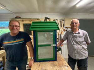 “Stepping up to Rowena’s challenge, Tony and Norman were keen to work on the project; the library is now complete and is soon to be available. Whilst visiting the workshop, Rowena was impressed by the items being produced and which will be for sale at various events in the town. These include occasional lamps, Lazy Susans, cheese boards, garden seed ‘tampers’ and bird boxes.